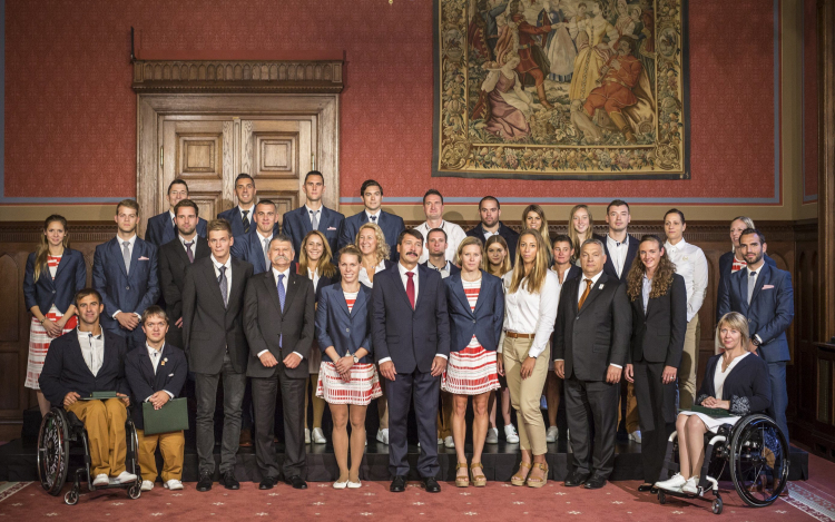 Balról-jobbra az első sorban: Suha Róbert kajakozó, Tunkel Nándor erőemelő, Tóth Tamás úszó, Kövér László házelnök, Szabó Gabriella kajakozó, Áder János köztársasági elnök, Kozák Danuta és Csipes Tamara kajakozók, Orbán Viktor miniszterelnök, Hosszú Katinka úszó, valamint Dani Gyöngyi és Szilágyi Áron vívók, a középső sorban: Kapás Boglárka, Kenderesi Tamás, Sors Tamás és Cseh László úszók, Hajmási Éva és Krajnyák Zsuzsanna vívók, Csonka András asztaliteniszező, Pap Bianka úszó és Biacsi Ilona atléta, a hátsó sorban: Imre Géza, Boczkó Gábor, Rédli András és Somfai Péter vívók, Vereczkei Zsolt úszó, Pálos Péter asztaliteniszező, Veres Amarilla vívó, Konkoly Zsófia úszó, Osváth Richárd vívó, Fazekas-Zur Krisztina kajakozó és Szász Emese vívó.